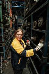 Portrait woman Middle east technician or engineer use walkie talkie checking auto part or car part at car part warehouse