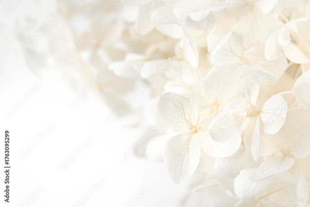 Macro close-up of white hydrangea flowers blooming against soft bright background