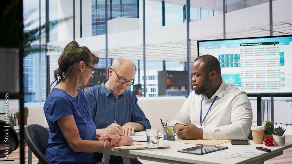 Financial adviser explaining retirement and pension options to old couple, potential contract terms to secure investment with life savings. Broker offers counseling for senior people. Camera B.