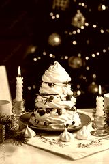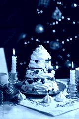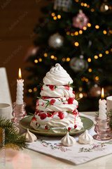 Christmas tree pavlova cake, festive dessert made with stacked meringue circles, with cream cheese and berries, currant and raspberries. Candles on a decorated table. Vertical image.