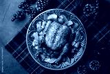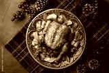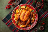 Overhead view of Christmas or New Year feast, roasted chicken stuffed with apples and oranges and served on a plate with baked potatoes, sage and rosemary, on a green and red tartan napkin.