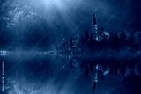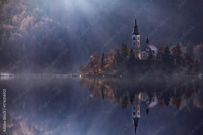 View Island with Catholic Church in Bled Lake. Bled is one of the most amazing tourist attractions in Slovenia. Concept Winter Landscape.