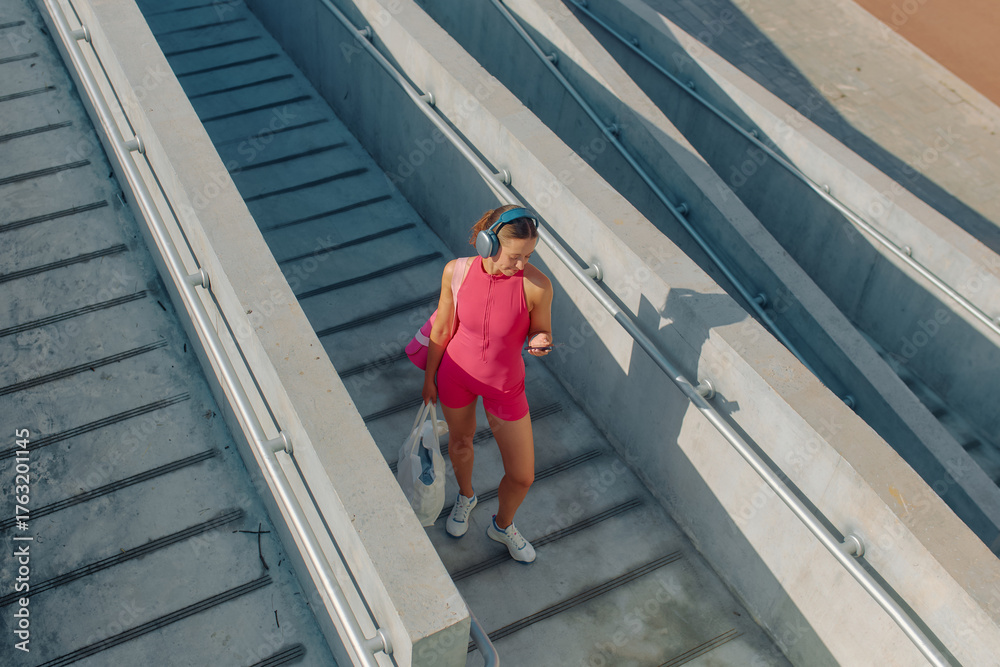 Woman in pink athletic outfit using phone while walking down outdoor stairs in a sports area
