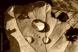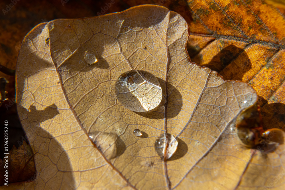 Close-up view of water droplets on a dried leaf resting on contrasting autumn foliage in sunlight showcasing nature's delicate details