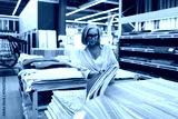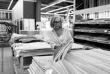 Customer examines decorative rugs in a home improvement store during a busy afternoon shopping