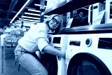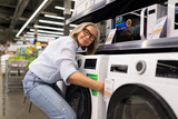 Woman examining appliances in a home goods store during a shopping trip in daylight