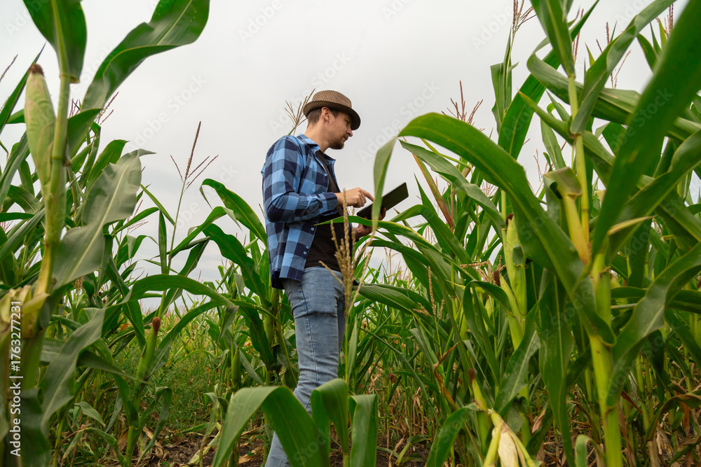 smart farm, a tablet and a person in the field of checking eco-resources, growing corn or managing an agribusiness.