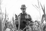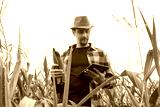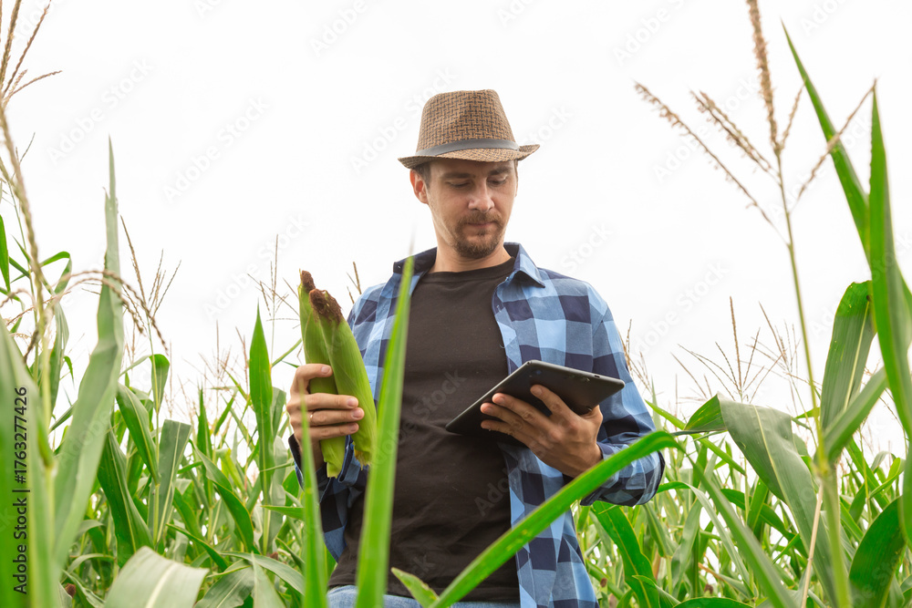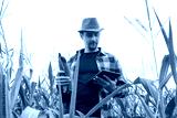 smart farm, a tablet and a person in the field of checking eco-resources, growing corn or managing an agribusiness.