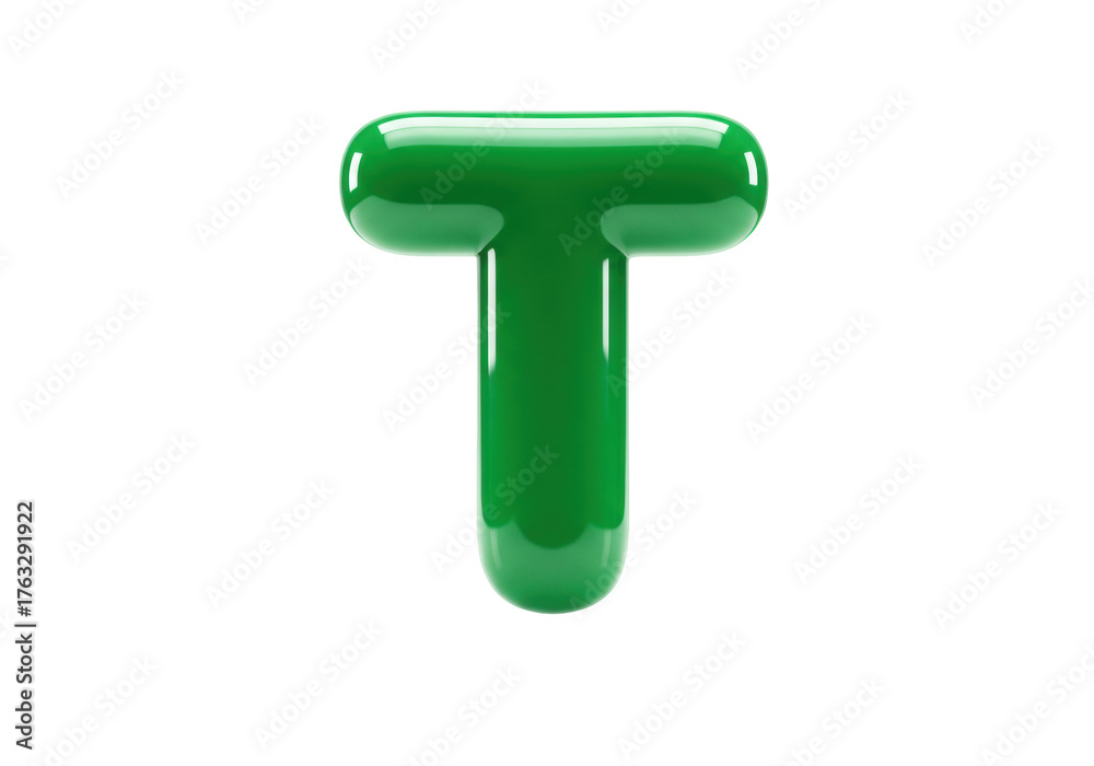 Isolated bright green letter T stands upright, rounded ends, light reflecting off surface