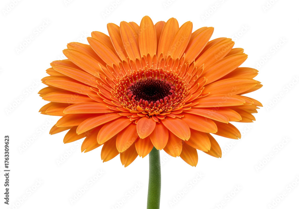 Isolated vibrant orange gerbera daisy flower with dark center petals and green stem, botanical