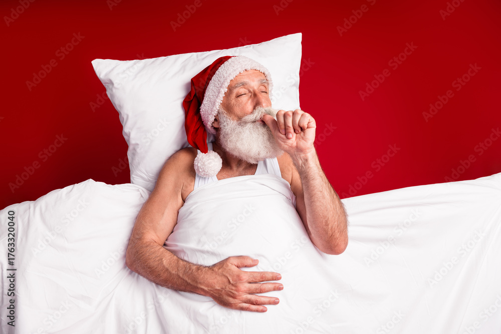 Santa Claus sleeps in a white bed under a red backdrop wearing a hat and pajamas for a cozy Christmas mood and holiday photo opportunity