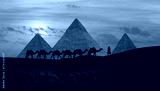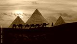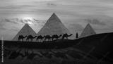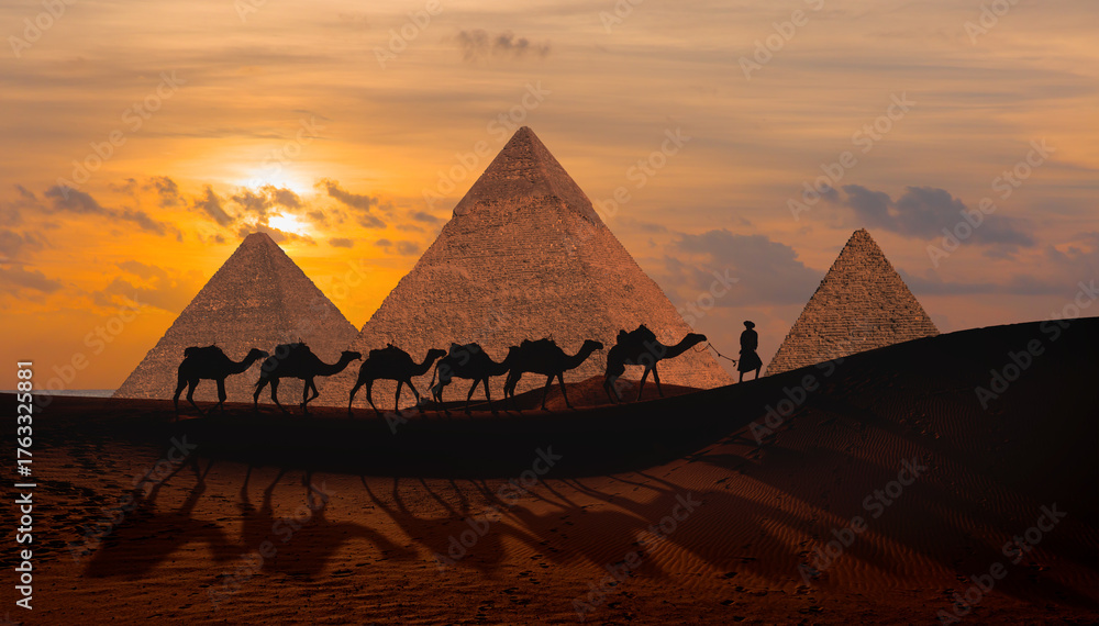 Camel caravan in front of the Great pyramid of Giza complex at amazing sunset - Cairo, Egypt