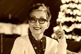 Charming senior woman in festive attire celebrating Christmas indoors with bright holiday lights and cozy decor