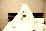 Man wrapping in blanket sitting with cup of coffee in bed