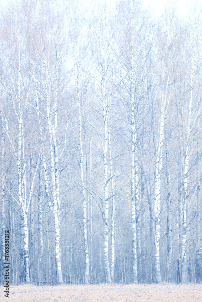 Landscape of early spring, trees and nature waking up, branches without leaves, first buds on the trees
