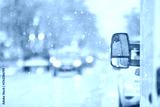 Snowfall on a city highway, blurred background, transport in winter weather, cars