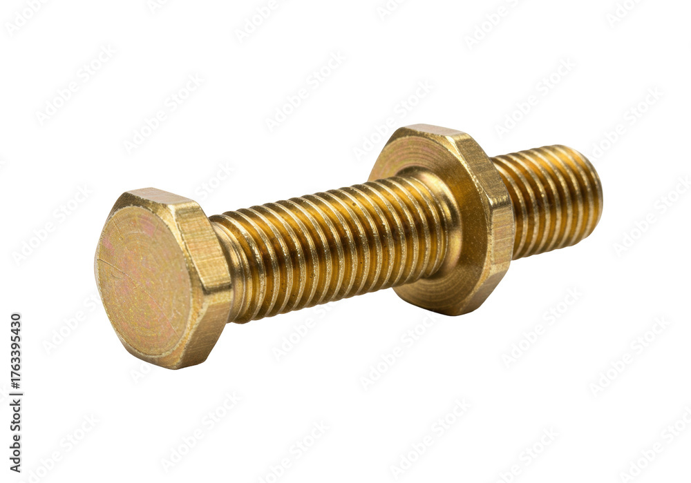 Isolated brass bolt with hex head and nut, industrial fastener, machine screw hardware item