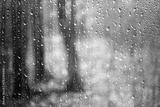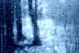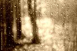 Wet weather, drops of autumn rain on the glass, autumn landscape outside the window, weather change