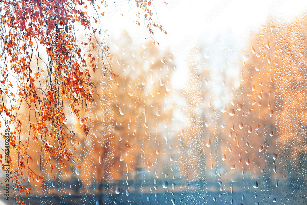 Wet weather, drops of autumn rain on the glass, autumn landscape outside the window, weather change
