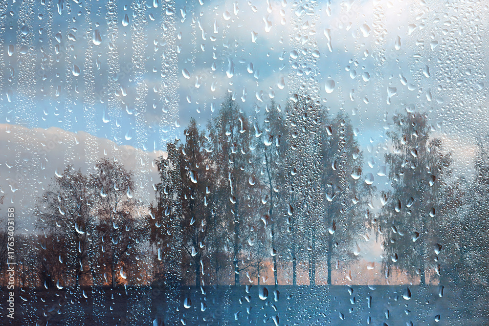 Wet weather, drops of autumn rain on the glass, autumn landscape outside the window, weather change