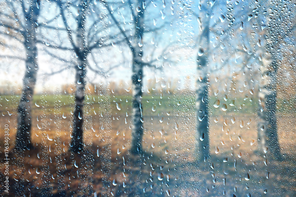 raindrops on glass blurred autumn background trees in the park, seasonal backdrop rainy weather