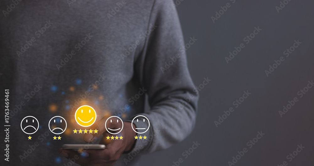 Review Customer, Young Man hand holding Smart Phone with five star to review and give 5 stars with very good results in service, Good review 5 star rating choice feedback