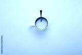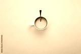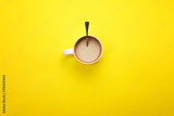 A Cup with coffee and spoon on a colored background. The concept of coffee breaks