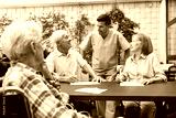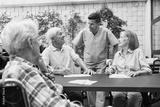 Elderly individuals with caregiver engaging in a group activity at rehabilitation center