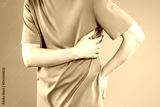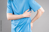 Heart attack, man with chest pain on gray background, myocardial infarction