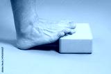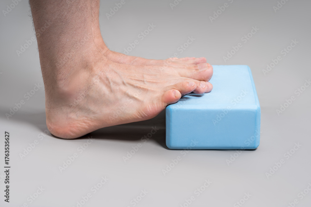 Individual balance training on a blue block with bare feet, demonstrating foot position and stability on a gray background