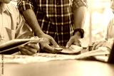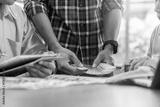 Team graphic designer checking print quality of media graphics proof print and color guides in printing industry. Selected focus
