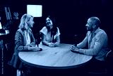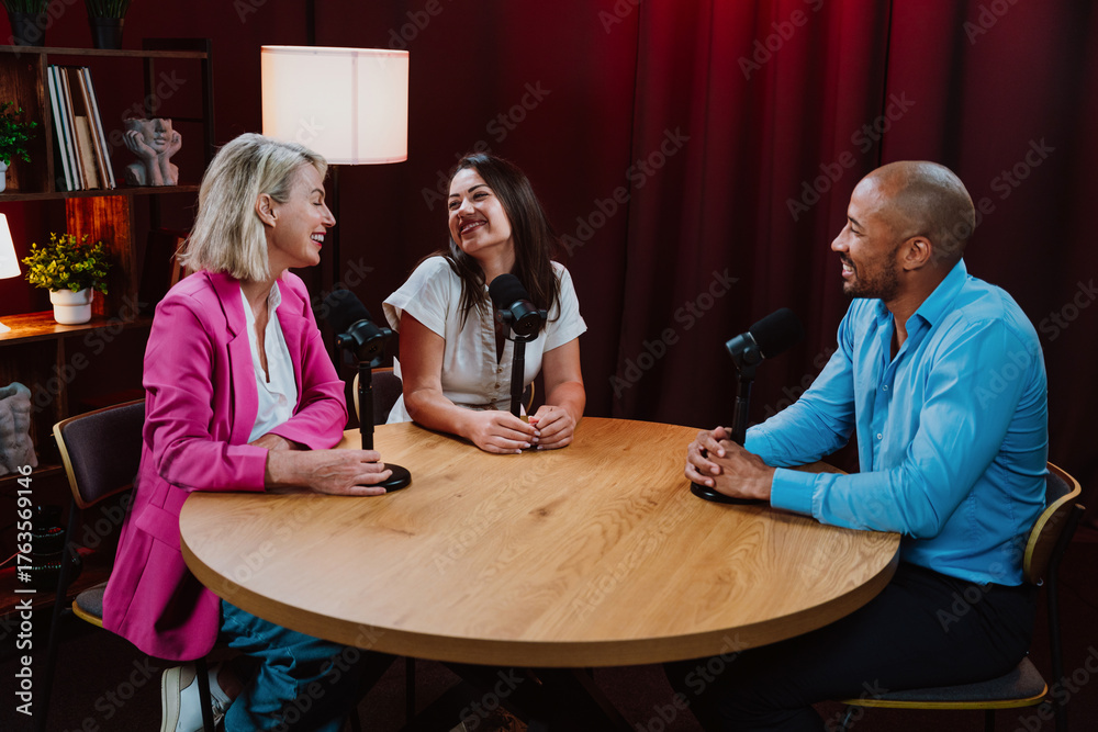 Group of hosts is capturing a live audio broadcast, engaging in a lively, amusing conversation around microphones and a laptop in a professional studio setting