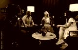 Group of hosts is capturing a live audio broadcast, engaging in a lively, amusing conversation around microphones and a laptop in a professional studio setting