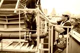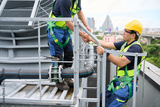 Construction workers collaborating on a building's rooftop while wearing safety equipment, symbolizing teamwork, diligence, and focus