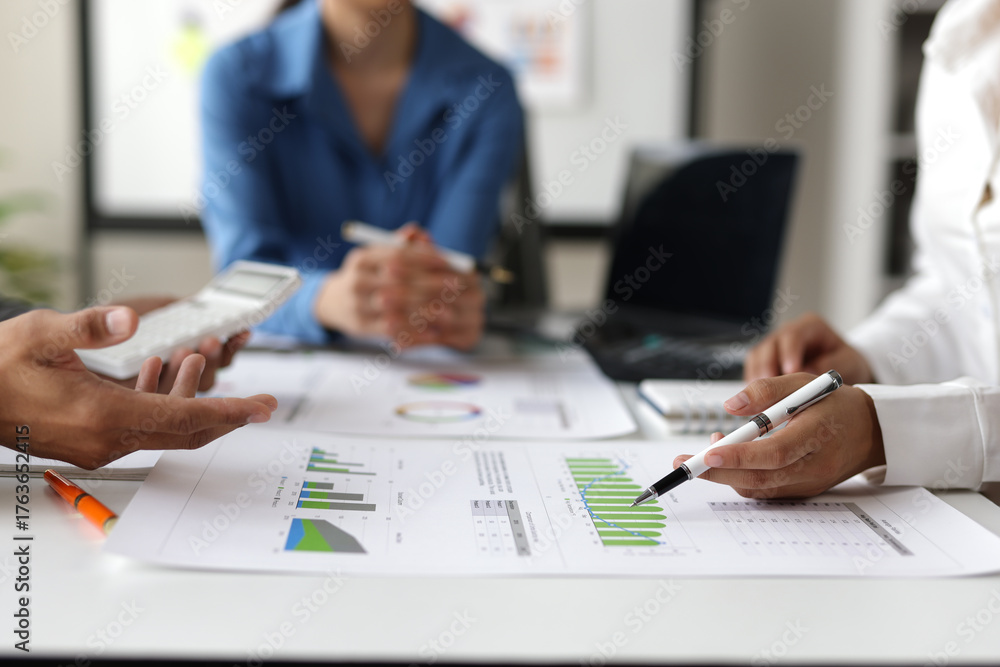 Business people analyzing financial charts and graphs at meeting, discussing company performance and making strategic decisions based on the presented data.