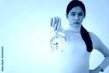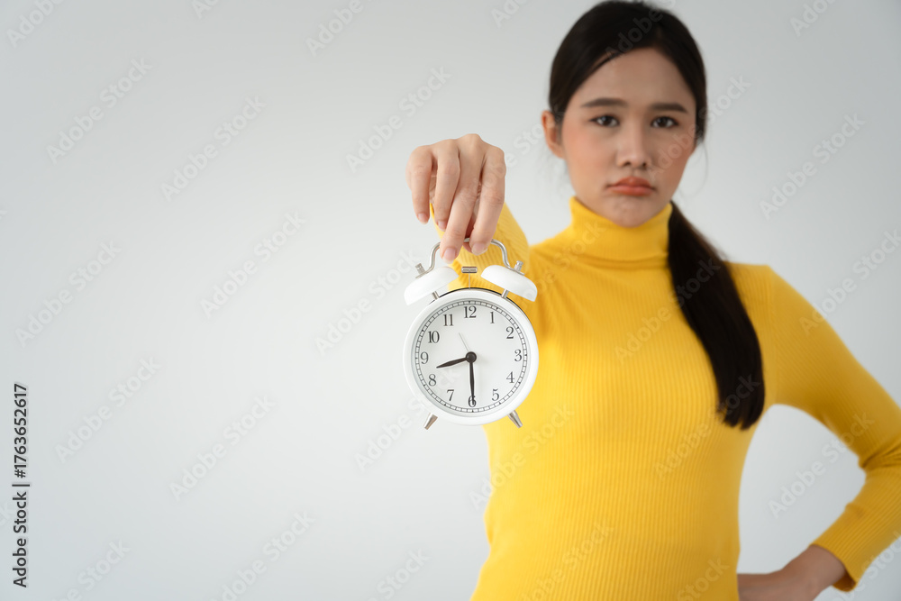 Stress Asia young woman show clock alarm, lady is late appointment or work or class study, overslept, difficulty get up in mornings, time worried, not on time, sleepy, over due, Hurry up time
