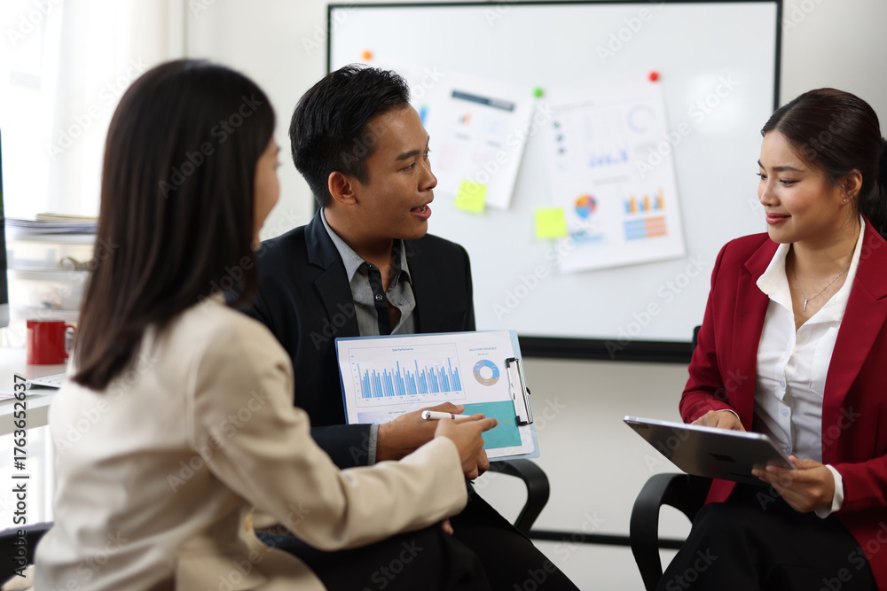 Asian businessman showing charts on paper to colleagues during corporate meeting.