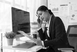Asian businesswoman holding a pen and touching her head while reading a document, displaying a pensive expression in her modern office, immersed in thought and facing workplace challenges.