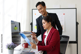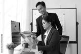 Two Asian businesspeople are collaborating on a project, analyzing charts and reports on a computer and documents, working together in office.
