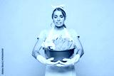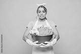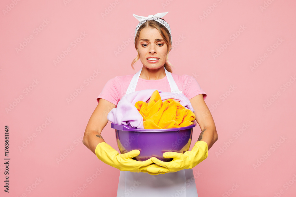 Young shocked sad dissatisfied scared woman she wears white apron hold basin clothes after laundry while doing housework tidy up isolated on plain pastel light pink background. Housekeeping concept.