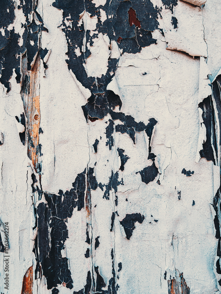 Peeling paint revealing layers of texture and color on an old wall in an urban environment