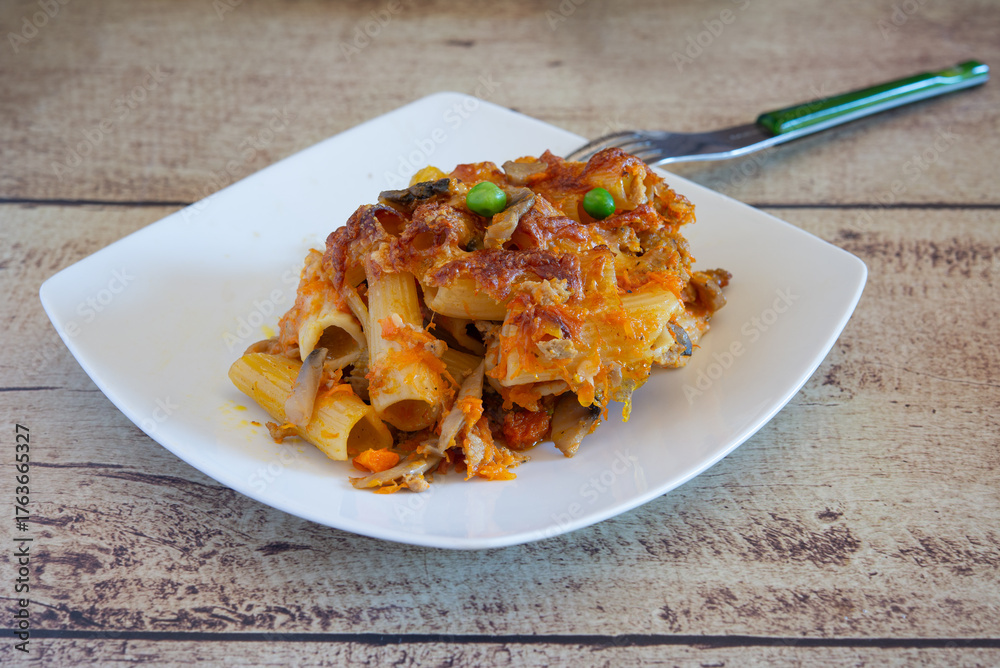 Rigatoni pasta baking with pumpkin, mushrooms, and peas
