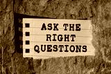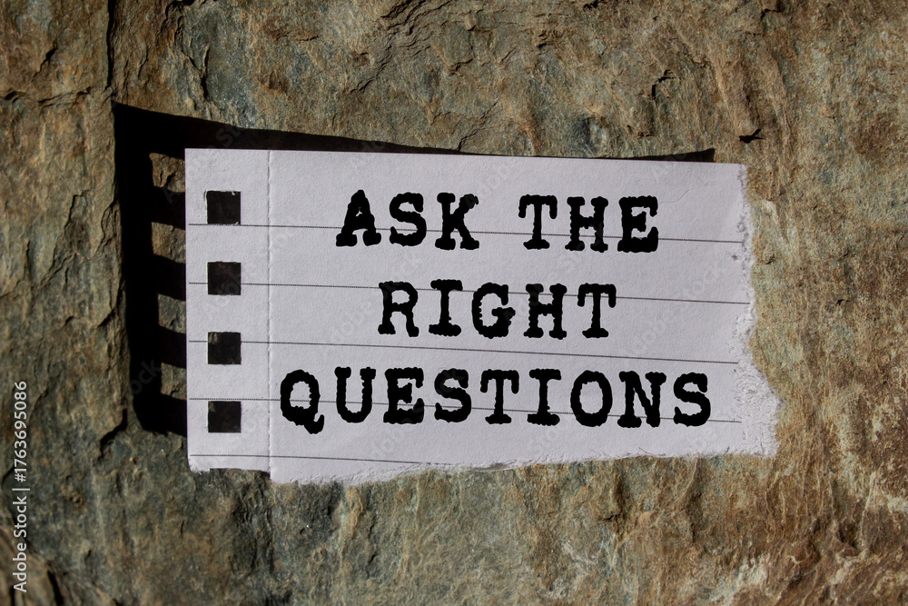 Ask The Right Questions message written on ripped torn lined paper piece on stone background. Conceptual Ask The Right Questions symbol. Copy space.
