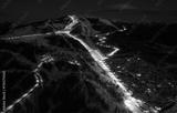 Winter night view of illuminated ski slopes and a village in a mountainous region