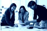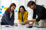 Business people analyzing financial charts and graphs, using calculator, working together on corporate project, pointing at statistics, discussing business strategy in office.