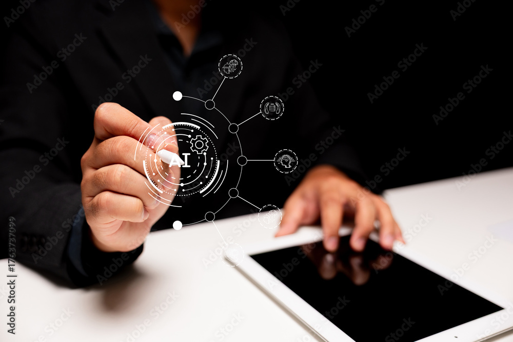 A professional examining digital data on a tablet, surrounded by graphic elements, showcasing technology and innovation in a business setting.
