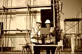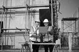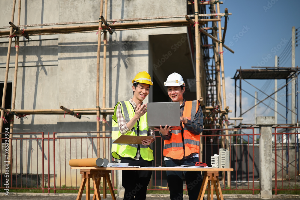 Construction supervisors discuss with a foreman about housing project progress while checking blueprints and data on a laptop