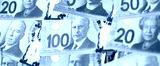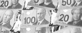 Canadian Dollar currency money bills. CAD currency banknotes in big bunch with different denomination close up
