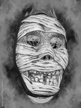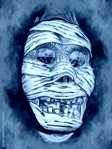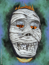 Mummy mask with fiery eyes surrounded by an eerie backdrop