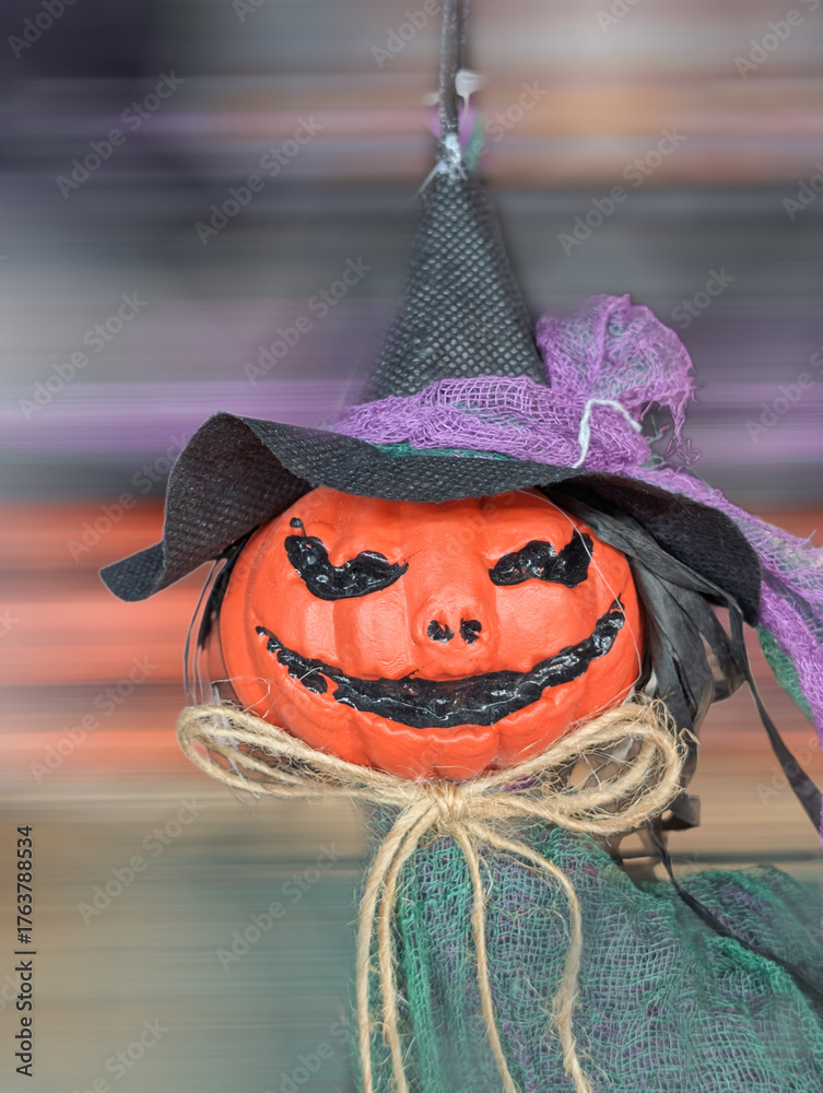 Halloween decoration featuring a smiling pumpkin wearing a witch hat and scarf in a festive setting